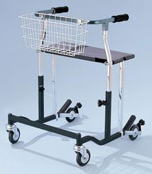 The slip resistant, non-marking, easy rolling neoprene wheels are ideal for indoor and outdoor use. The brakes are activated by applying pressure to the handlebar. The Safety Roller halts in step with the patient and the braking mechanism automatically engages if the client stumbles. Height adjustable in 1" increments from 29" to 36". Options include Width Adjustable Seat, Basket, Forearm rests. 09 117 5462 - Width 22.5